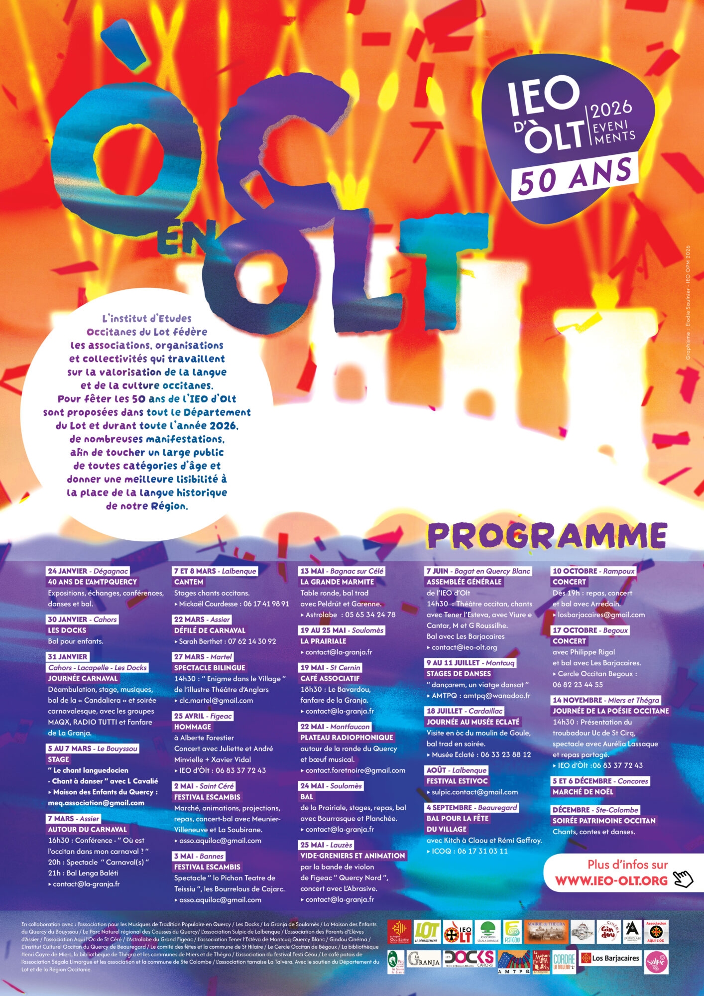 L’institut d’Etudes Occitanes du Lot, et sa section départementale, fédère les associations, organisations et collectivités qui travaillent sur la valorisation de la langue et de la culture occitane. Pour les 50 ans de l’IEO d’Olt sont proposées dans tout le Département du Lot et durant toute l’année 2026, de nombreuses manifestations, ceci afin de toucher un large public de toutes catégories d’âge, afin de donner une meilleure lisibilité à la place de la langue historique de notre Région.